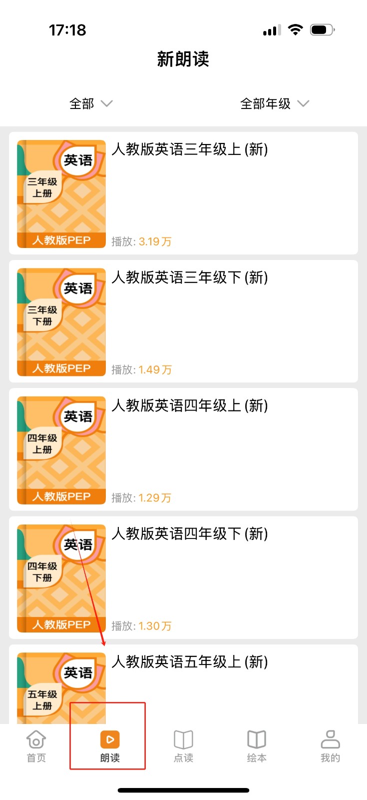 2、点击“朗读”选项,选择对应年级的英语教材进行朗读练习。