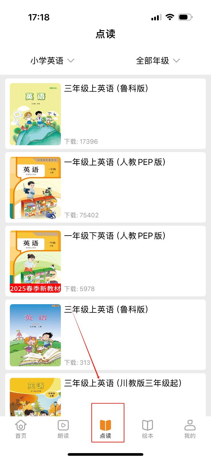 3、点击“点读”选项,下载并点读所需的小学英语教材。