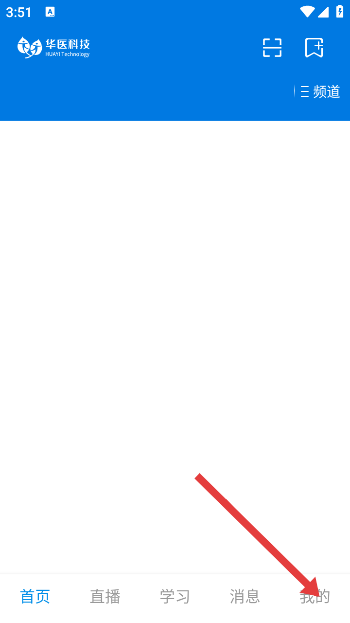 1、在华医科技APP首页,可浏览首页、直播、学习、消息等板块内容,点击【我的】进入个人页面。
