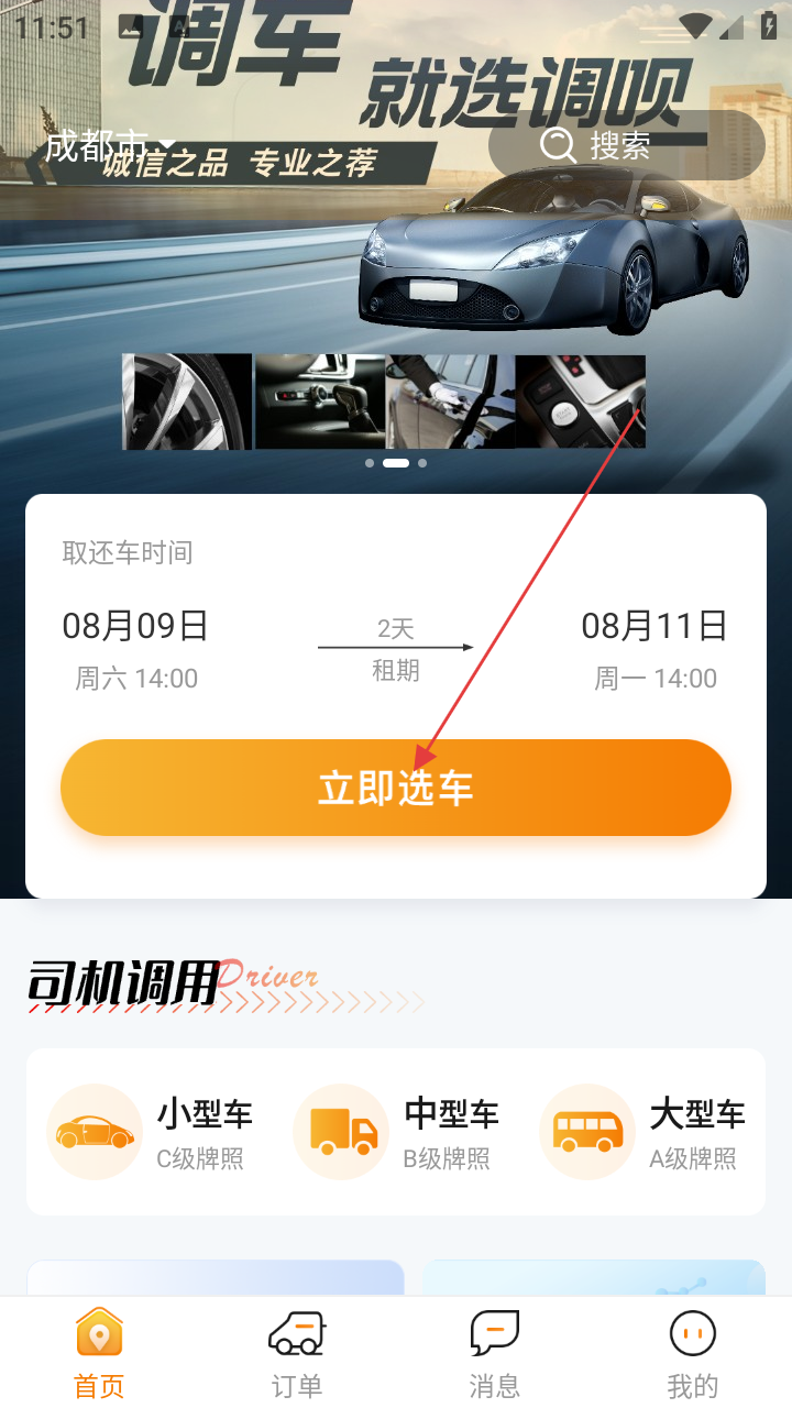 1、打开应用,选好取还车时间后,点击【立即选车】,进入车型列表页。