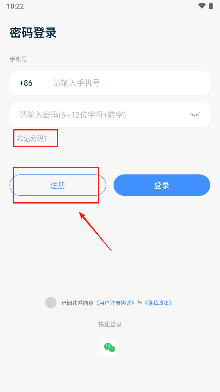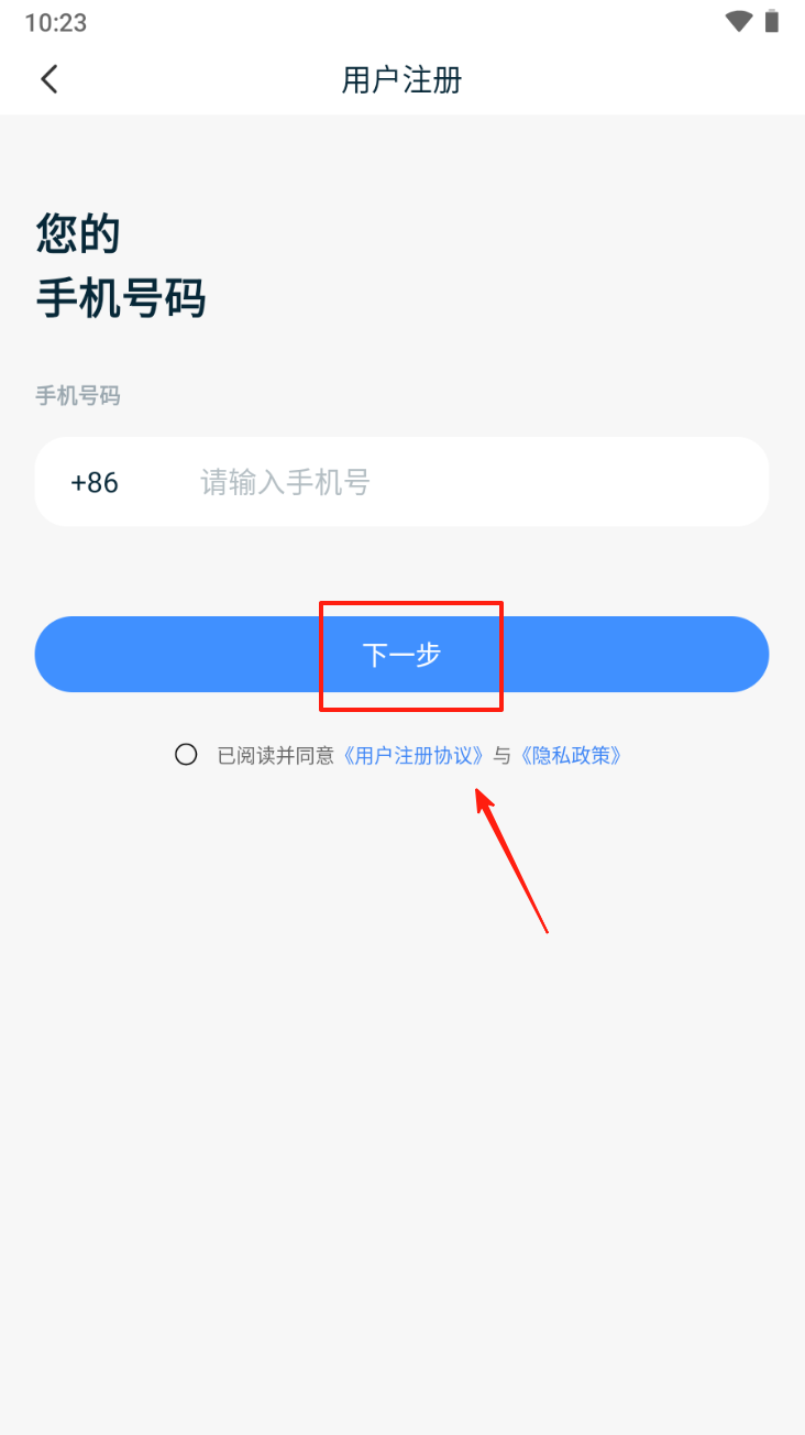 2、在注册页面,输入手机号并点击“下一步”。同意用户注册协议和隐私政策。