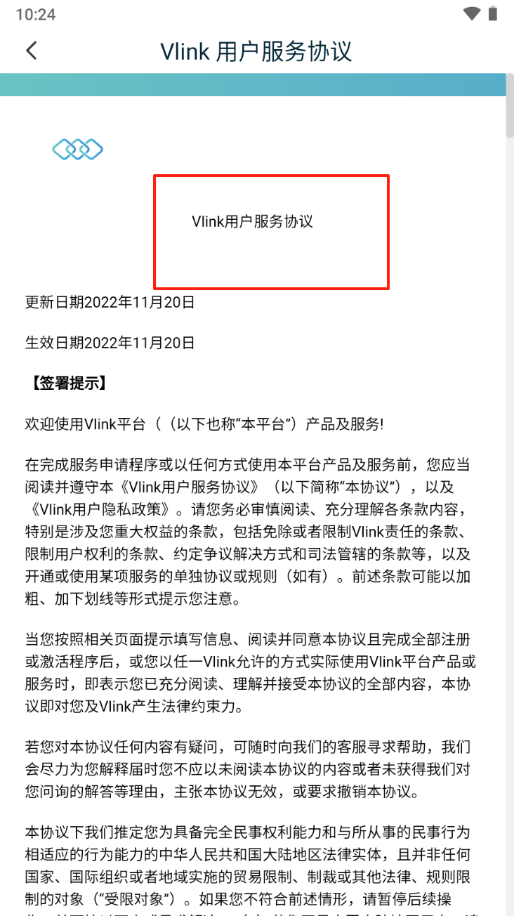 4、阅读并同意《Vlink用户服务协议》,了解平台规则和隐私政策。点击同意以继续。
