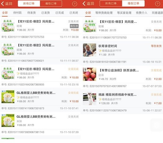 可以通过所有订单及维权订单两个大板块进行筛选。