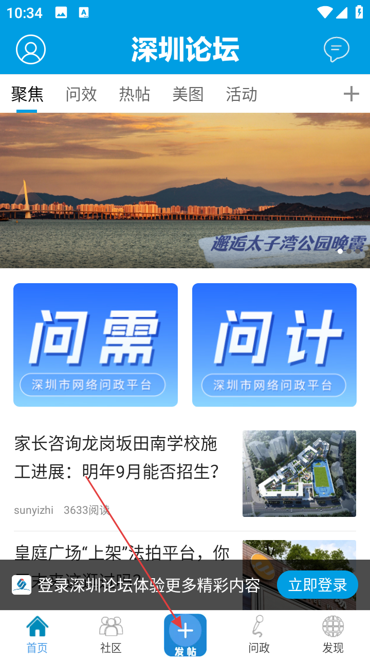 1、进入【深圳论坛】首页,点击底部【发帖】,开启发帖操作流程,进入发帖选择页。