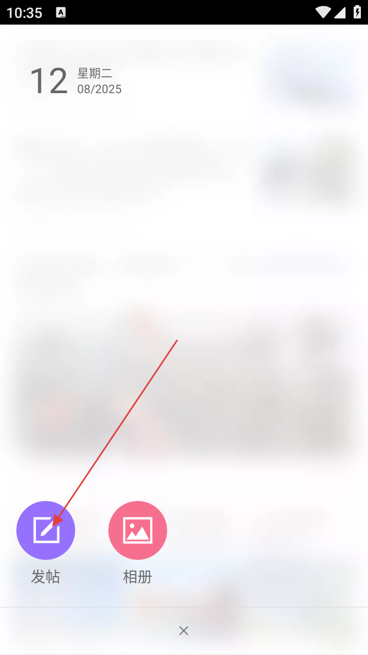 2、跳转至发帖选择页面,点击紫色【发帖】图标,进入版块选择界面。