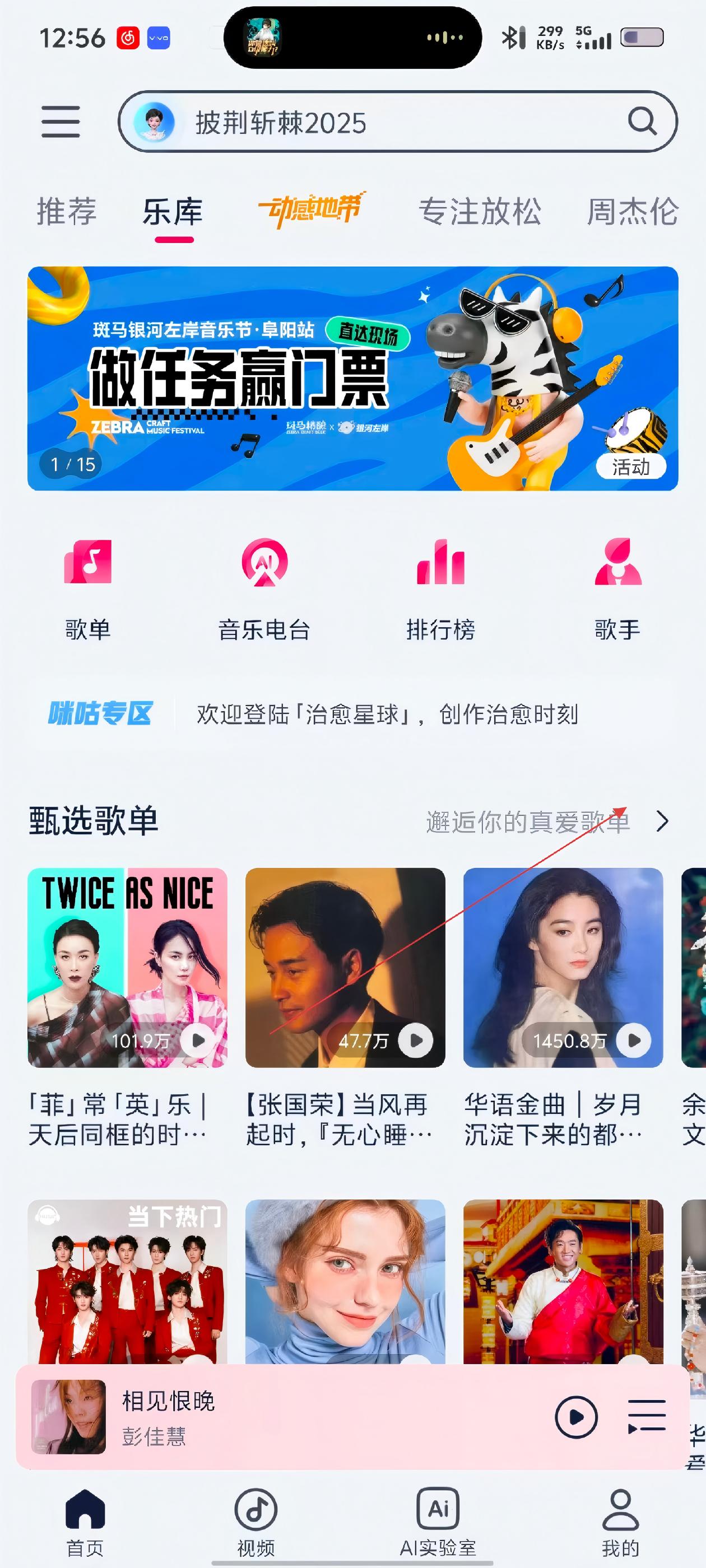 2、在乐库页面,有歌单、音乐电台等板块,点击“邂逅你的真爱歌单”。