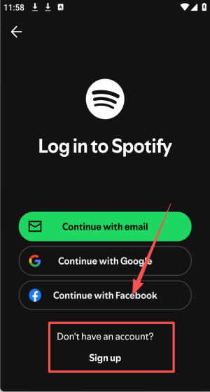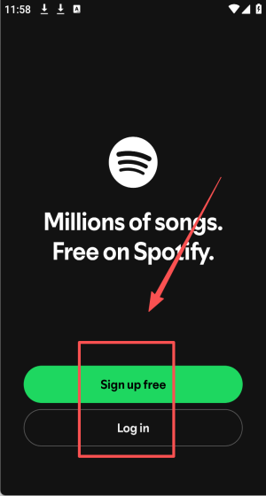 1、打开Spotify点中间Signup free,先选免费注册再登录享受千万曲库。