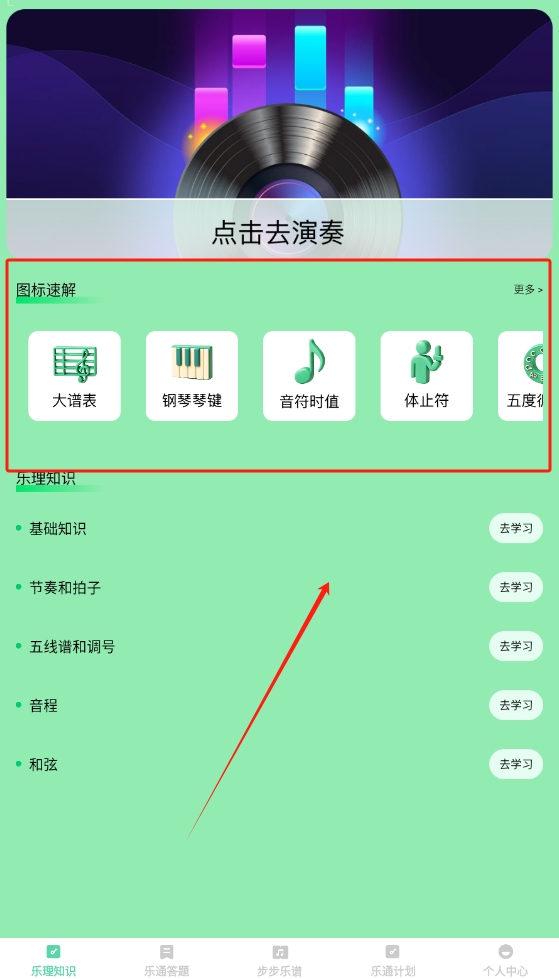 2、在首页选择乐理知识模块,浏览丰富的乐理课程,选择适合自己基础的知识点进行学习,确保从根本上掌握音乐基础知识。