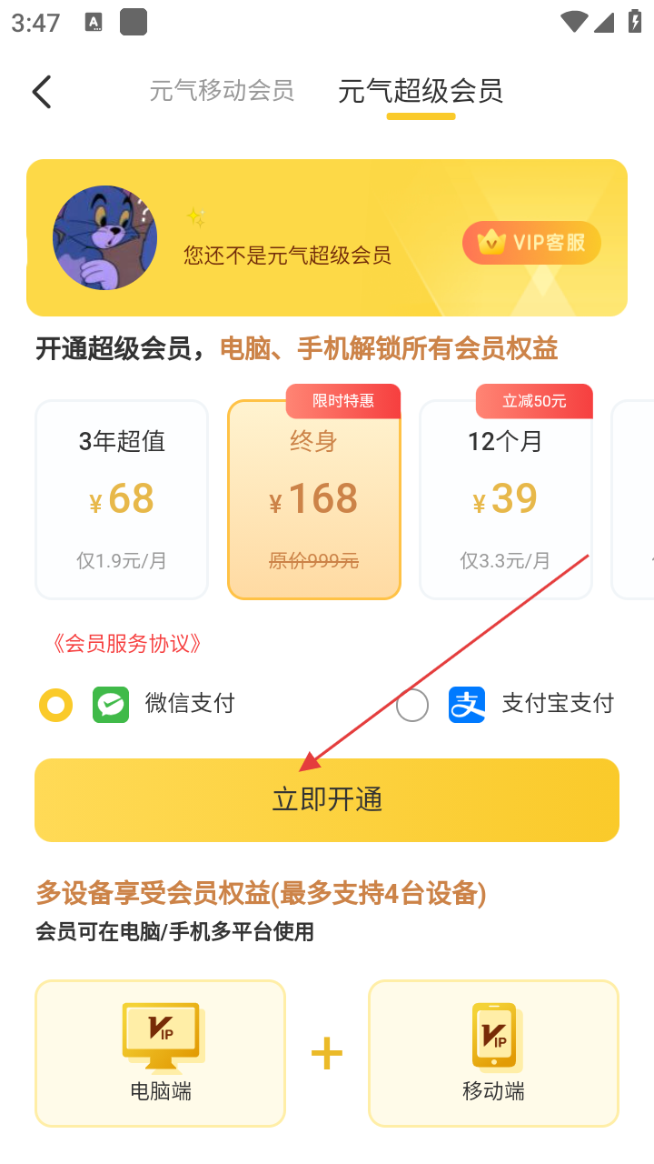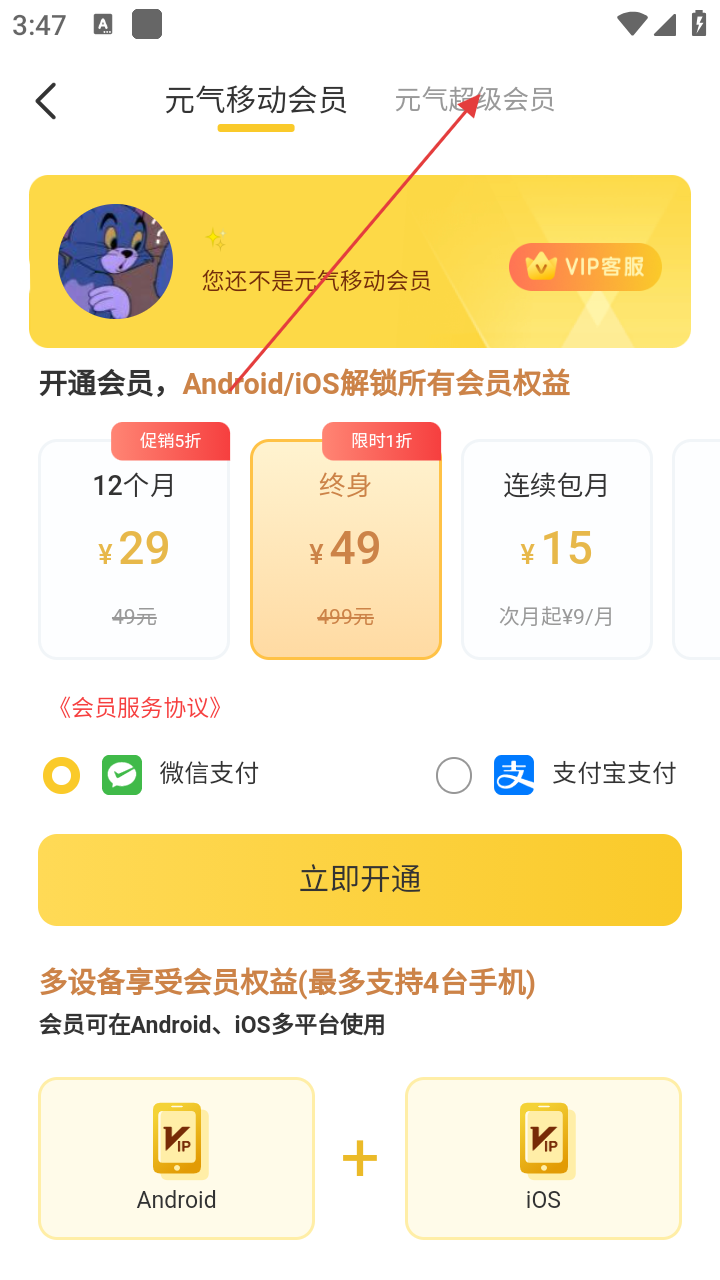 4、也可选择【元气超级会员】,查看相关价格后,点击【立即开通】完成会员开通。