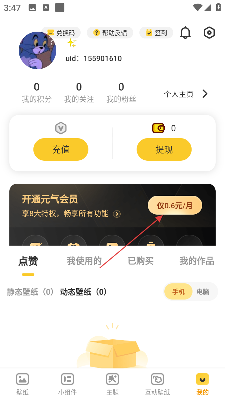 2、在个人页面,能看到积分、关注等信息,点击【仅0.6元/月】进入会员开通页面。
