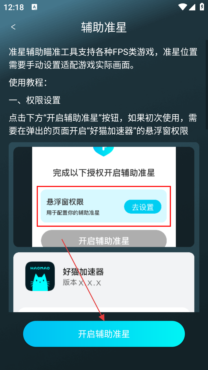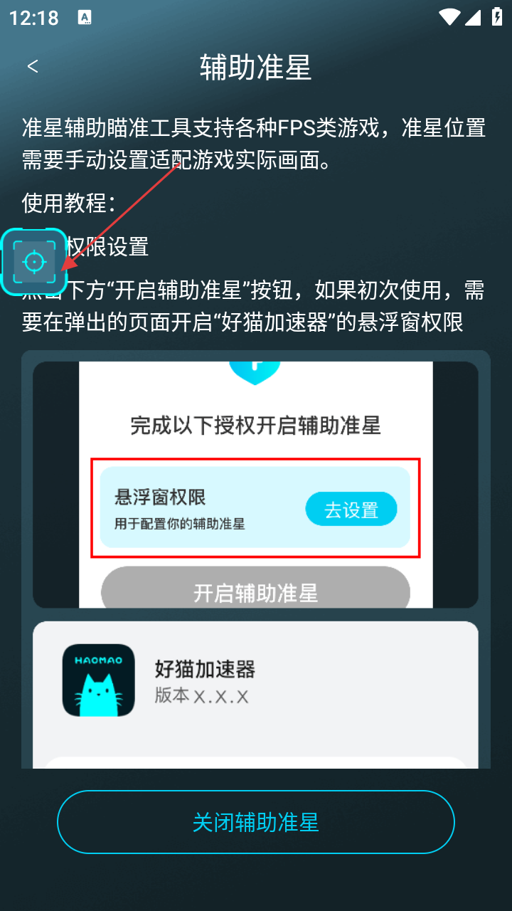 4、权限开启后,辅助准星功能即可启用,若要关闭,可在“辅助准星”页面点击【关闭辅助准星】按钮。