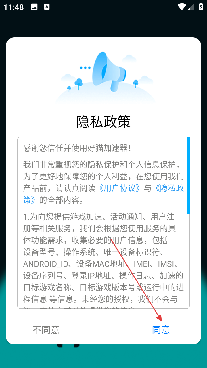 1、打开好猫加速器APP,首先会看到隐私政策页面,仔细阅读后,点击【同意】按钮。