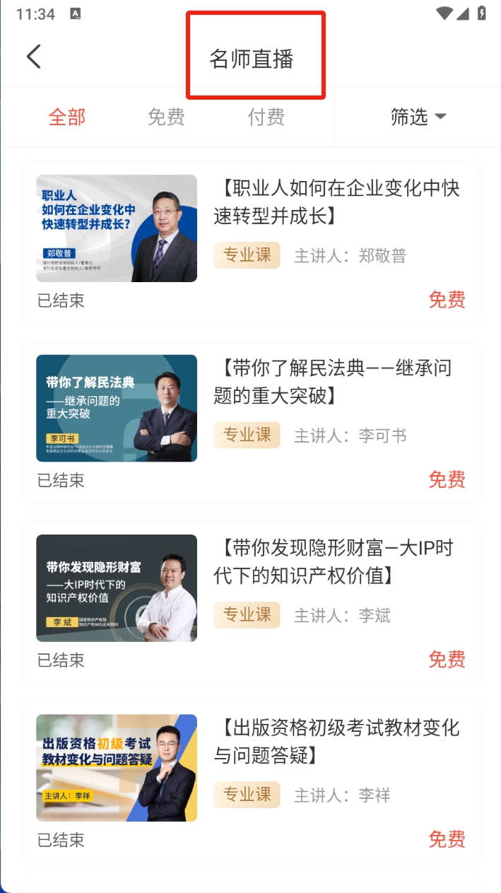 2、在名师直播页面,选择“免费”标签,浏览并选择感兴趣的课程,点击课程封面进入详情页。