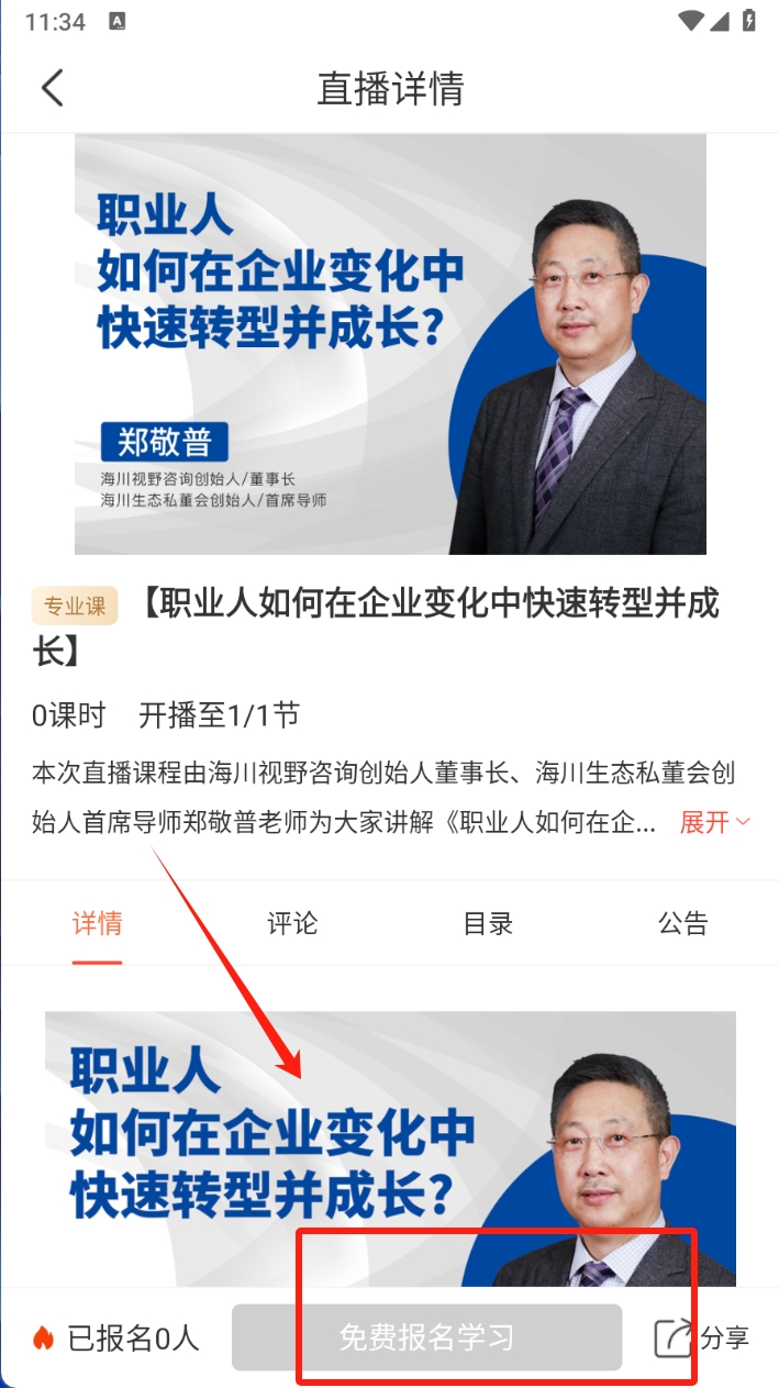 3、在课程详情页中,点击“免费报名学习”按钮,完成报名流程,开始学习课程内容。
