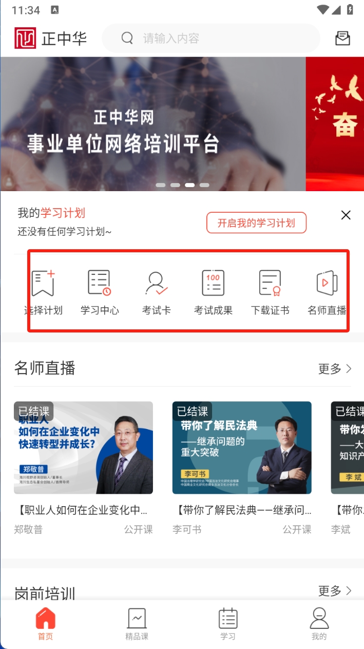 1、打开正中华网事业单位网络培训平台,点击“名师直播”按钮,进入直播课程页面,查看课程列表。