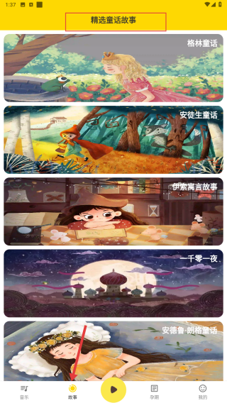 2、进入APP的【故事】页面可选择格林童话安徒生童话等分类点击后播放相应童话故事。