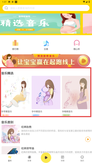 1、打开APP在首页可根据孕期阶段选择【音乐精选】中的胎教音乐也可在【音乐类别】挑选音乐类型进行播放。