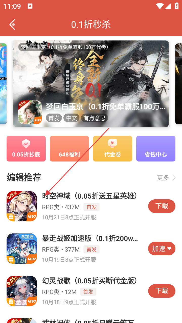 2、进入0.1折秒杀页面后,找到感兴趣的游戏,如【时空神域-(0.05折送五星英雄)】,点击进入该游戏详情页。