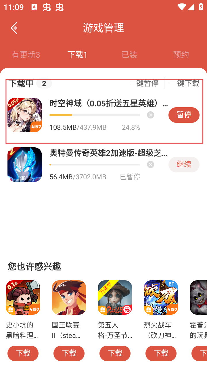 4、点击下载后,会进入游戏管理页面,可在该页面查看【时空神域-(0.05折送五星英雄)】的下载进度等情况。