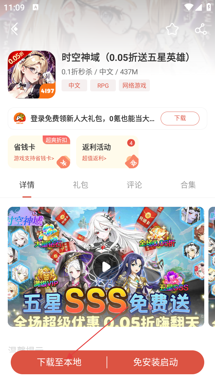 3、在【时空神域-(0.05折送五星英雄)】游戏详情页,若要下载游戏,点击【下载至本地】按钮,开始下载。