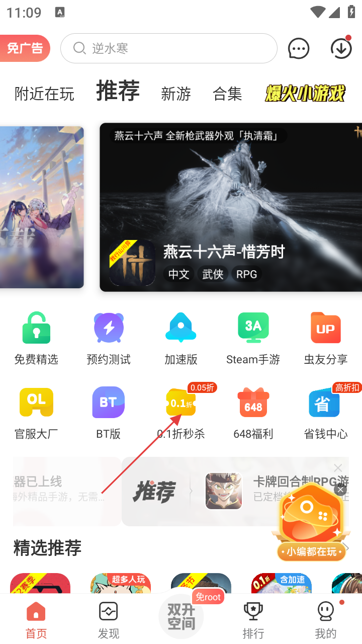 1、在虫虫助手主界面,若想参与0.1折秒杀活动,点击【0.1折秒杀】图标,进入0.1折秒杀页面。