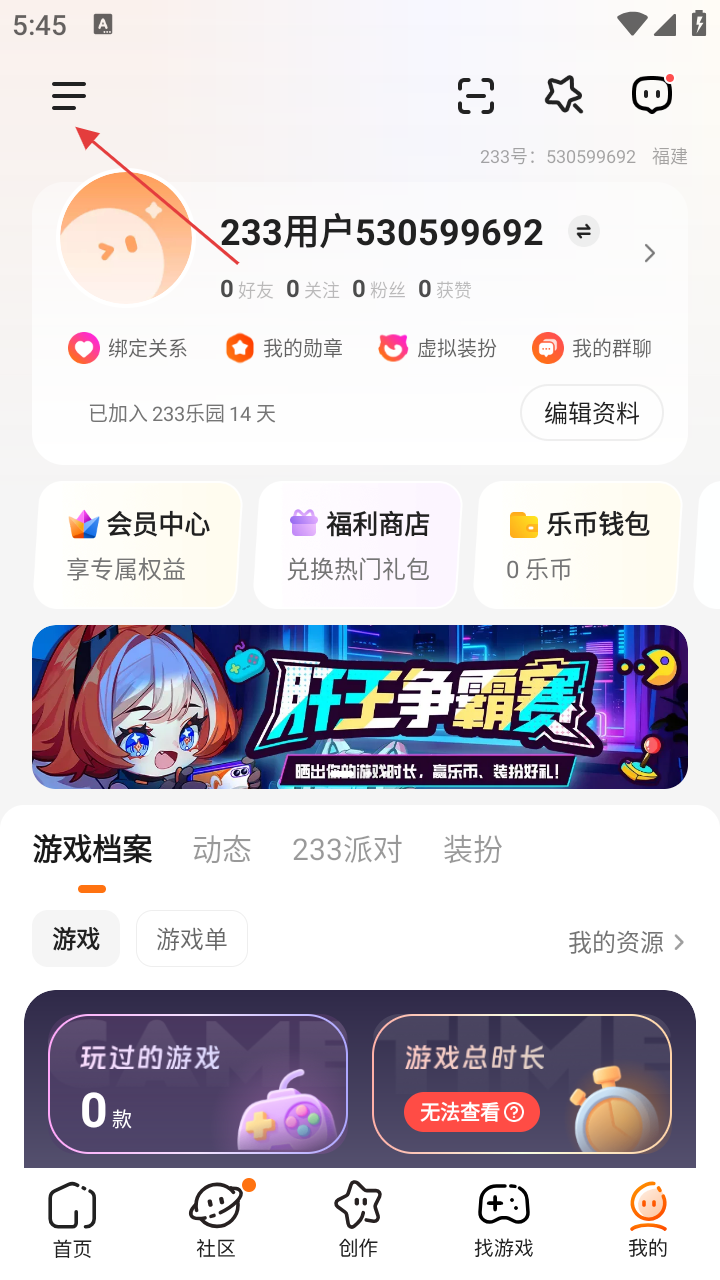 1、在233乐园首页,点击右下角【我的】,可进入个人相关界面,界面展示有用户信息、会员中心等功能入口。
