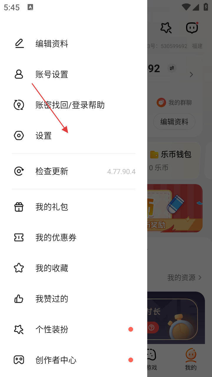 2、在【我的】界面,点击左上角菜单按钮,可展开功能列表,界面显示编辑资料、账号设置等选项。