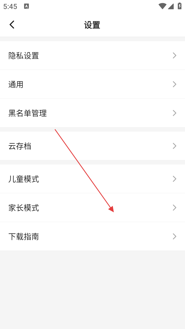 4、在设置页面,点击【家长模式】选项,可开启家长模式,开启后可对孩子的游戏时间、内容等进行管理。