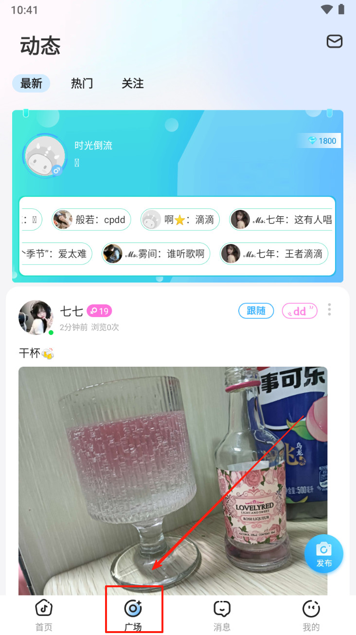 3、在动态页面,点击底部导航栏中的“广场”图标,查看最新动态。