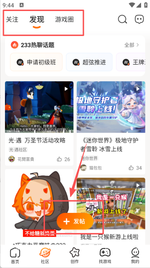 3、切换到 “发现” 界面,浏览话题内容后点击 “发帖” 按钮,发布自己的动态内容。