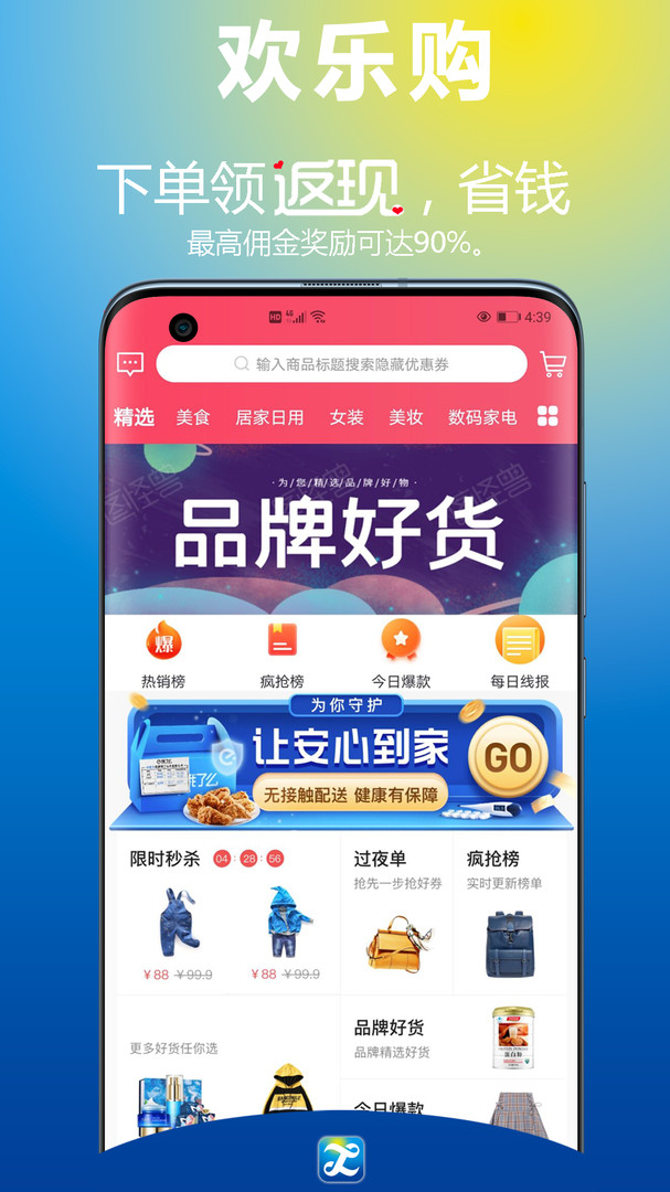 九号欢乐购app安卓版2024下载安装是一款网购软件。开心购物为用户提供丰富的优质商品,涵盖衣食住行等所有主要消费品,满足用户不同的购物需求。快乐购可参与每天更新的线上促销活动,大量低价商品在线抢购,并可享受下单支付返利领取红包分享商品赚取佣金等福利。感兴趣的小伙伴赶快下载最新的软件版本吧。