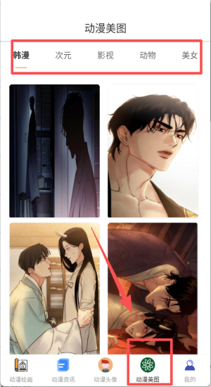 4、点击“动漫美图”图标,浏览各种动漫风格的美图。