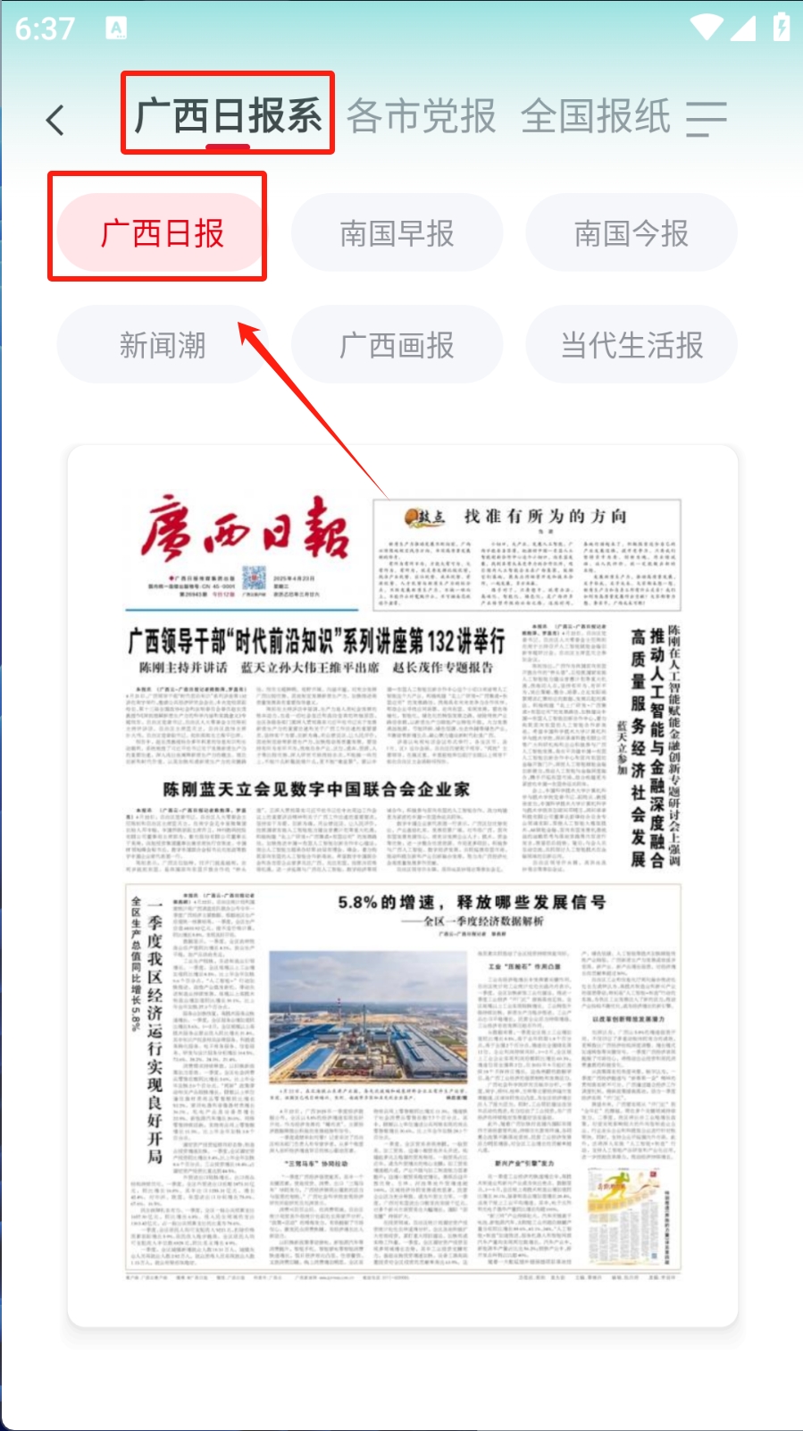 4、在电子报列表中,点击“广西日报系”,然后选择“广西日报”查看详细内容。