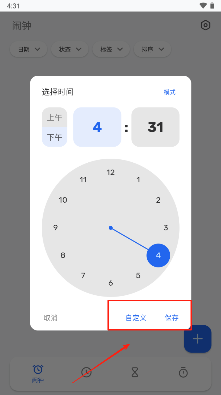 4、设置闹钟时间:选择时间并点击“自定义”或“保存”以设置闹钟。