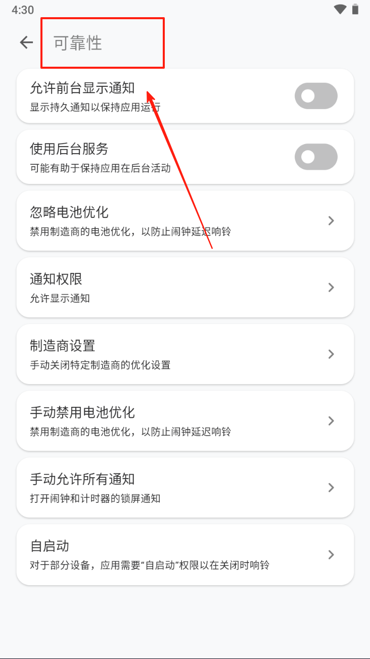 2、调整可靠性设置:进入设置中的“可靠性”选项,允许前台显示通知以确保应用正常运行。