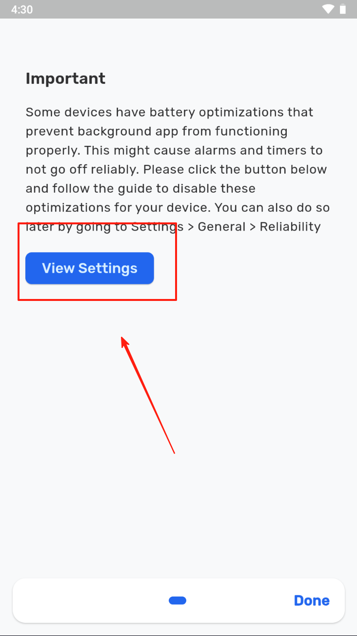 1、查看设备电池优化设置:点击“View Settings”按钮以查看和调整电池优化设置。