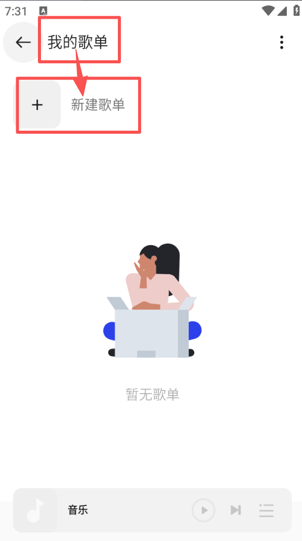 2、在 “我的歌单” 页面,点击 “新建歌单”,能创建属于自己的音乐歌单来分类收纳歌曲。