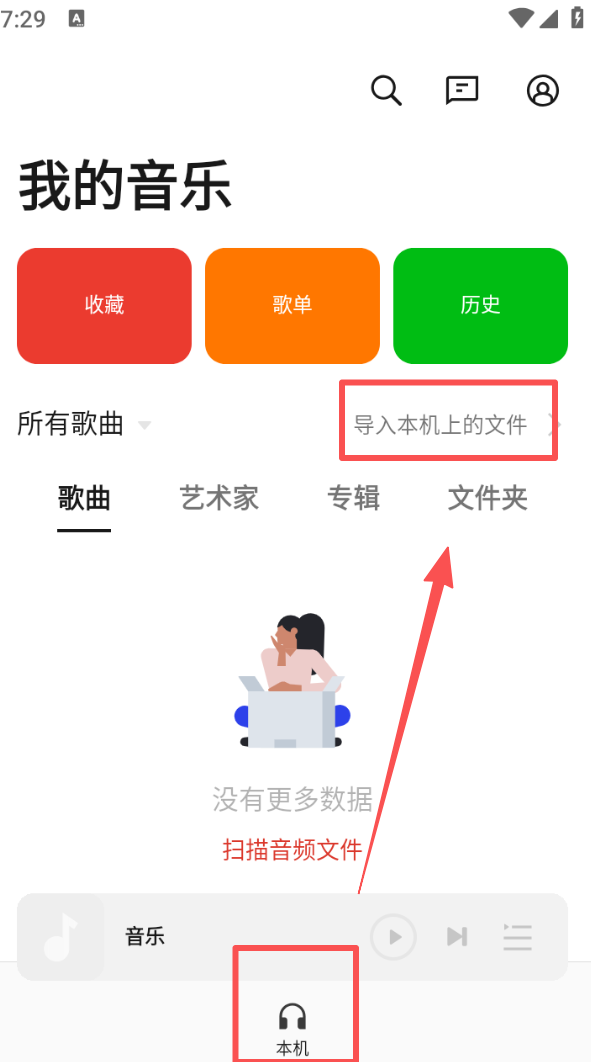 1、进入软件后,点击底部 “本机” 选项,再找到 “导入本机上的文件” 按钮,可将本地音频导入到软件中。