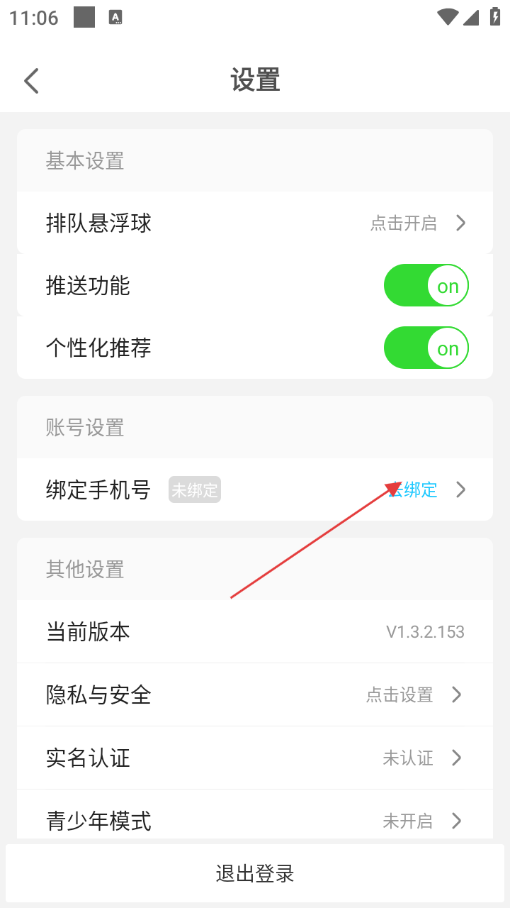3、在设置页面,点击【绑定手机号】选项,进入绑定手机页面。