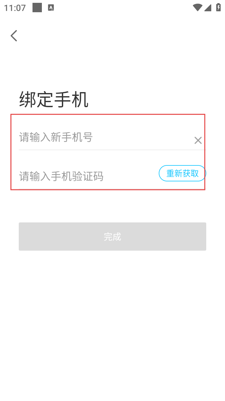 4、在绑定手机页面,输入新手机号和手机验证码,点击【完成】按钮,即可完成手机号绑定操作。