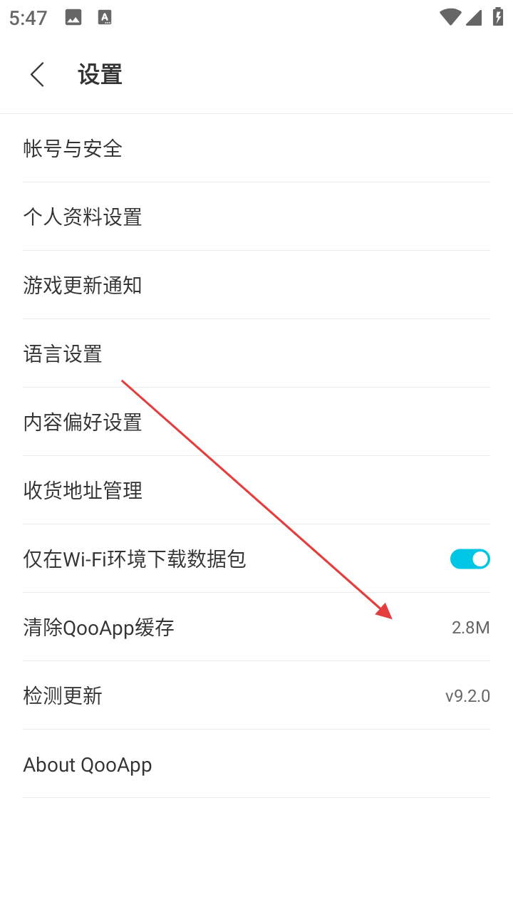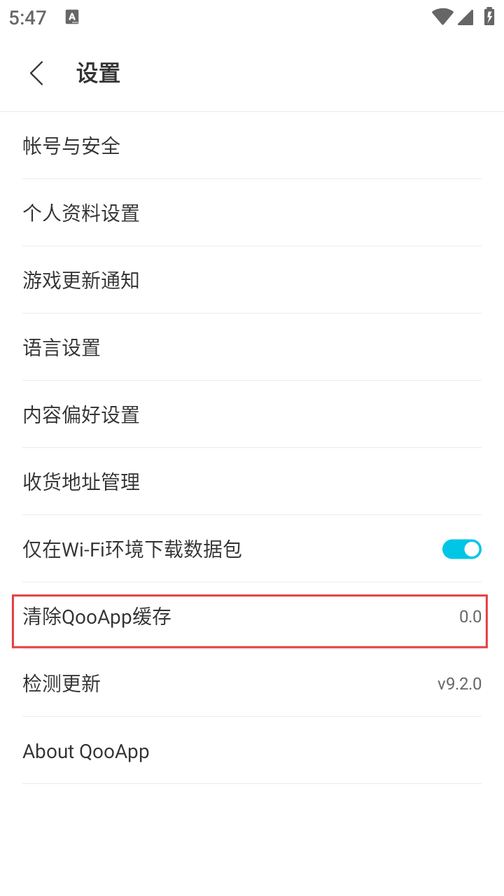 3、在设置页面,点击【清除QooApp缓存】选项,可清理APP缓存,释放存储空间。