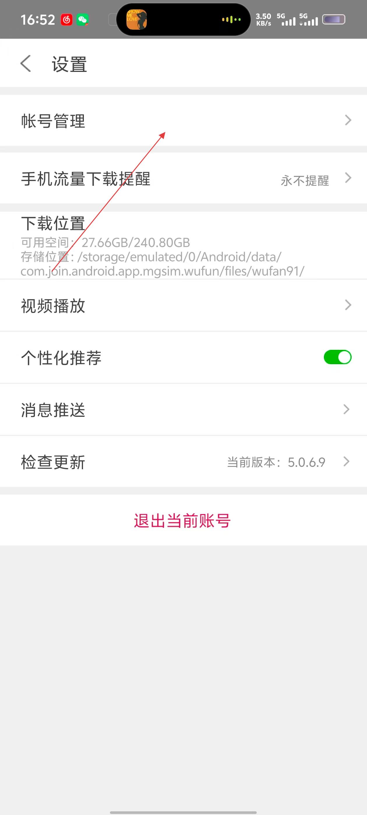 3、在设置页面,点击【帐号管理】选项,可进入个人信息页面。