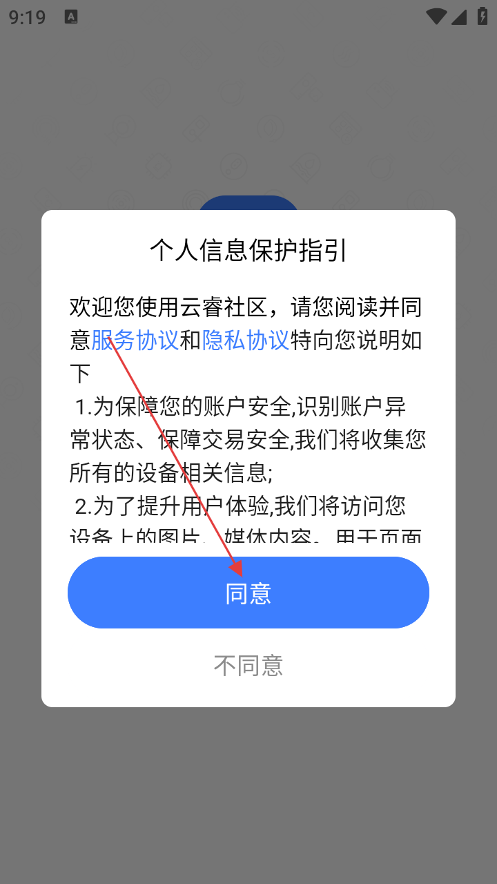 1、首次使用应用,阅读【个人信息保护指引】弹窗点【同意】,接受协议。