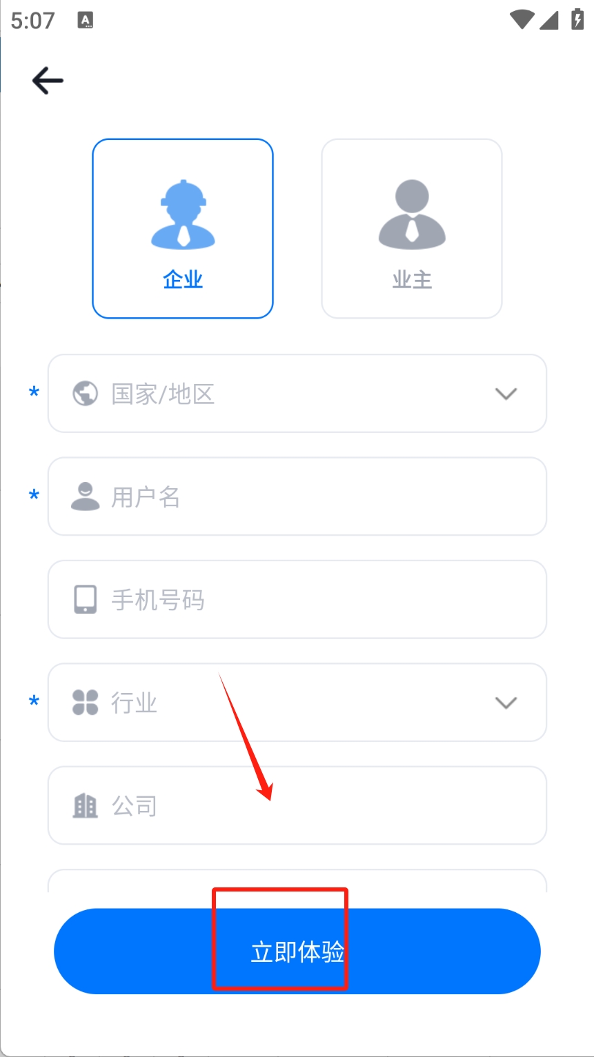 3、填写企业信息,点击“立即体验”完成注册。