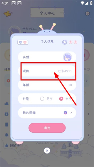 3、在个人信息编辑页面,点击昵称,即可修改昵称。