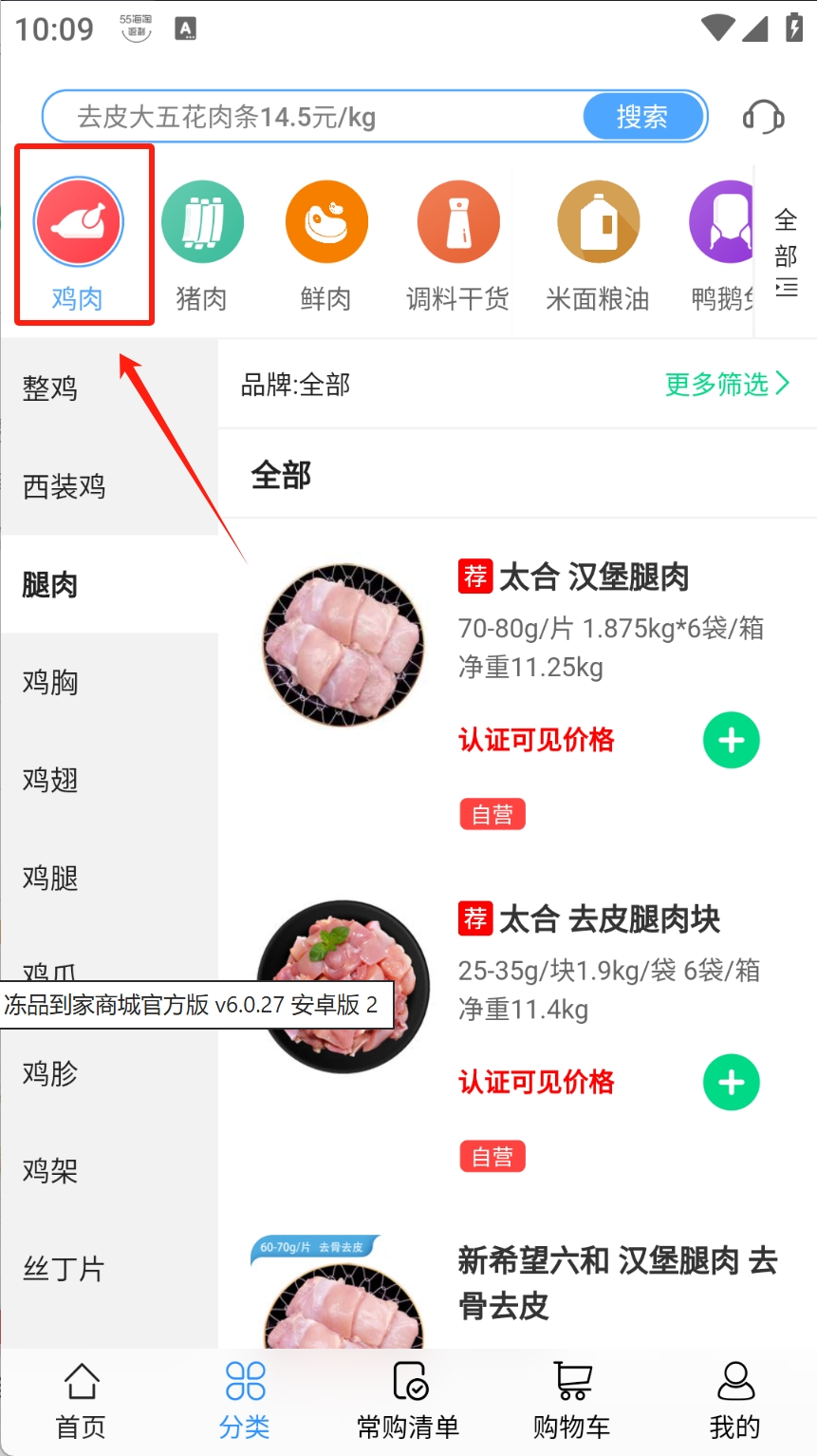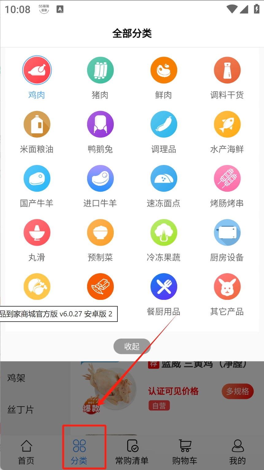 2、查看商品,点击“鸡肉”图标查看具体商品列表。