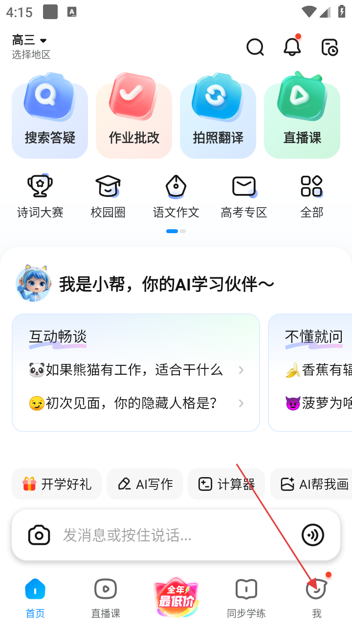 1、作业帮首页有【搜索答疑】【作业批改】等功能,还有互动板块,若要进入个人页面,点击右下角【我】。