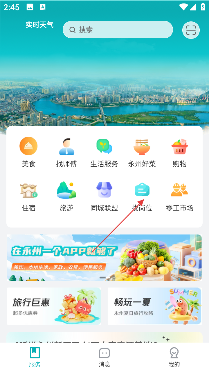 1、打开应用,在服务页点【找岗位】,进入求职板块。