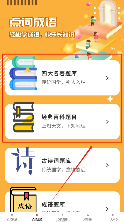 点词成金为用户提供了丰富多彩的成语学习体验,凭借答题挑战,成语故事等多样化的学习模式,使用户能够在轻松愉快的氛围中提升自我的认知水平,这个平台汇聚了海量的学习资源,不仅满足用户日常学习的需求,还能让学习过程变得更加高效和充实。