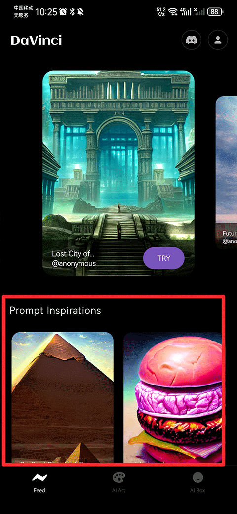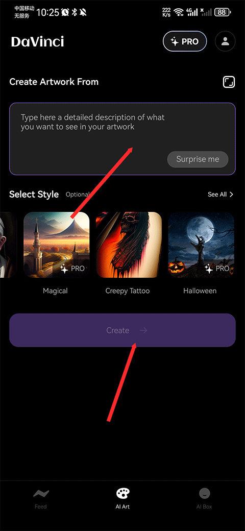 3、点击后会跳转至AI Art界面中,接着在上方文本框中输入您希望在您的艺术作品中看到的详细描述,然后点击create